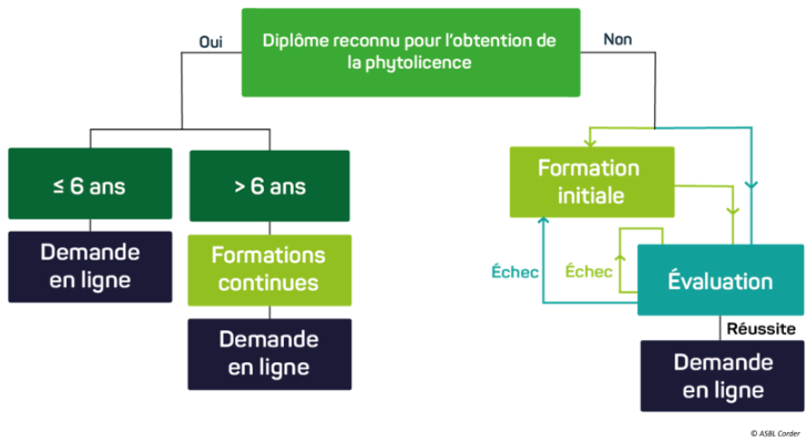 - Disposer d’un diplôme reconnu pour l’obtention de la phytolicence (Diplômes, certificats et attestations valables | Phytoweb ) datant de moins de six ans, et introduire une demande en ligne via le site internet du SPF santé public : Demandez votre phytolicence | Phytoweb. Si le diplôme est reconnu mais date de plus de six ans, il faut soit réussir une évaluation, soit suivre plusieurs séances de formation continue. Le nombre de séances varie selon le type de phytolicence demandé, (3 pour P1, 4 pour P2), disponible sur Agenda des formations | CORDER ASBL. Ensuite introduire la demande en ligne.
